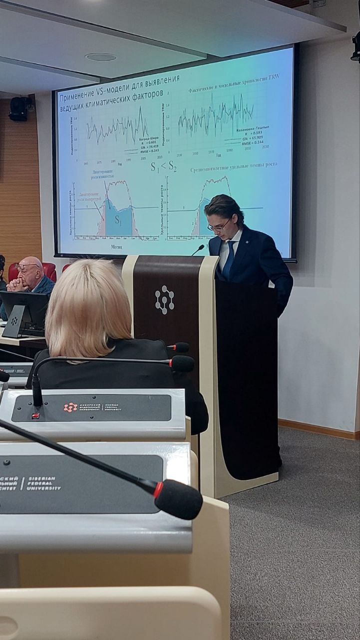 22 апреля 2025 г. в Красноярске, на заседании Диссертационного совета Д99.0.036.02 на базе СФУ и ФИЦ КНЦ СО РАН состоялась защита диссертации на соискание ученой степени кандидата биологических наук по специальности 1.5.15 – Экология (биологические науки) по теме "Длительные хронологии клеточной структуры годичных колец сосны обыкновенной как комплексный климатический индикатор", представленной Дергуновым Дмитрием Романовичем. Защита прошла успешно, все присутствующие члены диссертационного совета единогласно проголосовали за присуждение ученой степени.